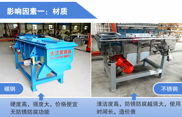 直線篩材質分為碳鋼和不銹鋼兩種,碳鋼材質(如:Q235)它的硬度高,強度大,價格便宜,是多行業常用的材質,但是它沒有防銹防腐功能,所以對于衛生環境要求較高的就推薦您使用不銹鋼材質(如:304)它的材質清潔度高,防銹防腐越強大,不會污染物料,使用時間長,造價也相對高,所以在夠買的時候您也要根據成本預算來進行選擇。