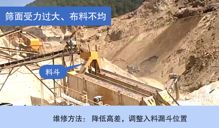 漏斗和圓振篩入料端距離太高,礦石從漏斗進(jìn)入圓振篩時(shí),對(duì)入料處沖擊力過(guò)大,導(dǎo)致入料處大梁斷裂、箱體開(kāi)裂等問(wèn)題;礦石進(jìn)入圓振篩入料端后,分布不均勻,礦石總是往一側(cè)跑,只有一半的篩網(wǎng)起到篩分作用,導(dǎo)致一邊積礦嚴(yán)重,篩分效率低。